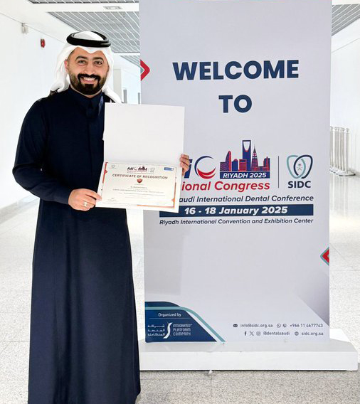 تبارك #جامعة_الملك_عبدالعزيز للدكتور عبدالعزيز محمد القرني طالب الدراسات العليا بقسم استعاضة الفم والوجه والفكين بـ #كلية_طب_الأسنان حصوله على المركز الثالث في عرض المسابقات الإكلينيكية Clinical case presentation in SIDC 2025 ، في المؤتمر الإقليمي للاتحاد العالمي لطب الأسنان (FDI) والمنعقد بالتزامن مع المؤتمر السنوي للجمعية السعودية لطب الأسنان 2025 SIDC وبالتعاون مع المنظمة العالمية لأبحاث طب الأسنان